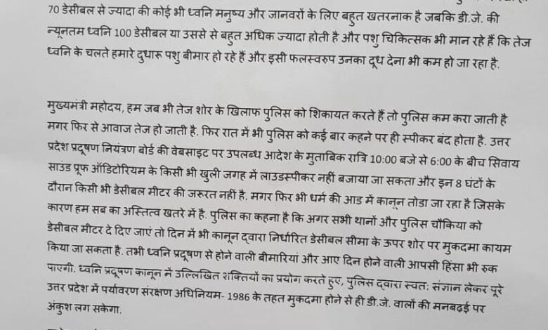 सोमवार को मुख्यमंत्री को दिये गए पत्र में कहा गया है कि पिछले 6-7 वर्षों से ऐसा हो रहा है कि जब-जब बहुत अधिक तेज डी.जे. बजता है, तब-तब गांव की गायों का दूध देना कम हो जा रहा है। विज्ञान की किताबों के मुताबिक अच्छे स्वास्थ्य के लिए 40 से 50 डेसीबल की ध्वनि उचित होती है और कानून ने पहले ही 65 से 70 डेसीबल तक की ध्वनि की अनुमति दे रखी है। 70 डेसीबल से ज्यादा की कोई भी ध्वनि मनुष्य और जानवरों के लिए बहुत खतरनाक है जबकि डी.जे. की न्यूनतम ध्वनि 100 डेसीबल या उससे से बहुत अधिक ज्यादा होती है और पशु चिकित्सक भी मान रहे हैं कि तेज ध्वनि के चलते हमारे दुधारू पशु बीमार हो रहे हैं और इसी फलस्वरुप उनका दूध देना भी कम हो जा रहा है।