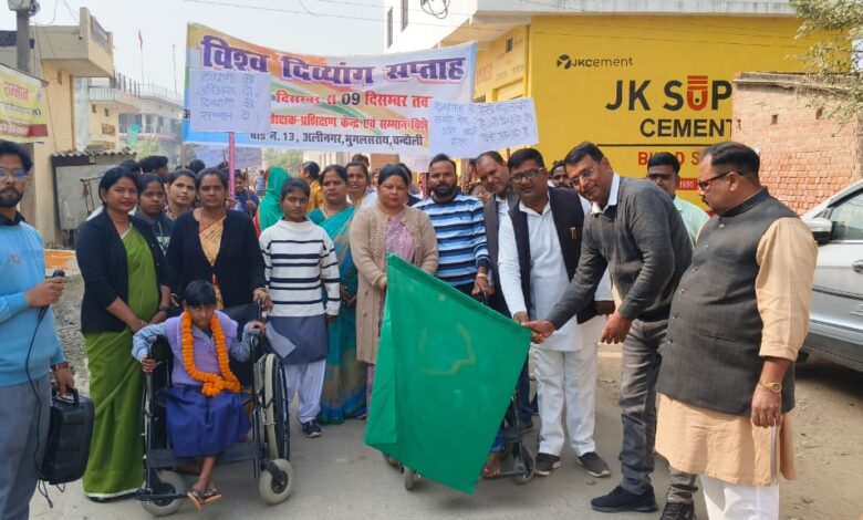 पीडीडीयू नगर चंदौली: विश्व दिव्यांग दिवस के मौके पर सम्मान विशेष विद्यालय तथा सम्मान शिक्षण प्रशिक्षण केंद्र की ओर से अलीनगर में जागरूकता रैली निकाली गई इसके साथ ही संस्था के साप्ताहिक कार्यक्रम की शुरुआत हो गई रैली के माध्यम से भारत सरकार और संविधान में दिव्यांगों के प्रति दिए गए अधिकारों के प्रति जागरूक किया गया रैली की शुरुआत मुख्य अतिथि दिव्यांग सशक्तिकरण अधिकारी राजेश नायक सर ने हरी झंडी दिखाकर शुरुआत की विशिष्ट अतिथि राकेश रोशन आइकॉन चंदौली ,सरफराज अहमद और कोर्स सम्यक पुष्पा कुशवाहा रीमा सिंह ,सपना ,धनेश ,रोशन संध्या पाल नूर हसन प्रिया नेहा सुशीला इत्यादि एवं प्रशिक्षण की उपस्थित रहे धन्यवाद ज्ञापन संजय कुमार के द्वारा किया गया l