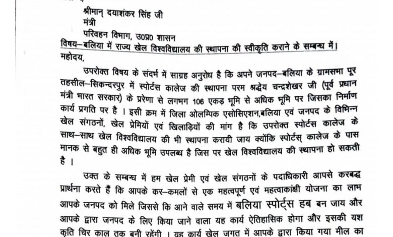बलिया में राज्य खेल विश्वविद्यालय की स्थापना की स्वीकृति के लिए संसद को सौंपा पत्रक