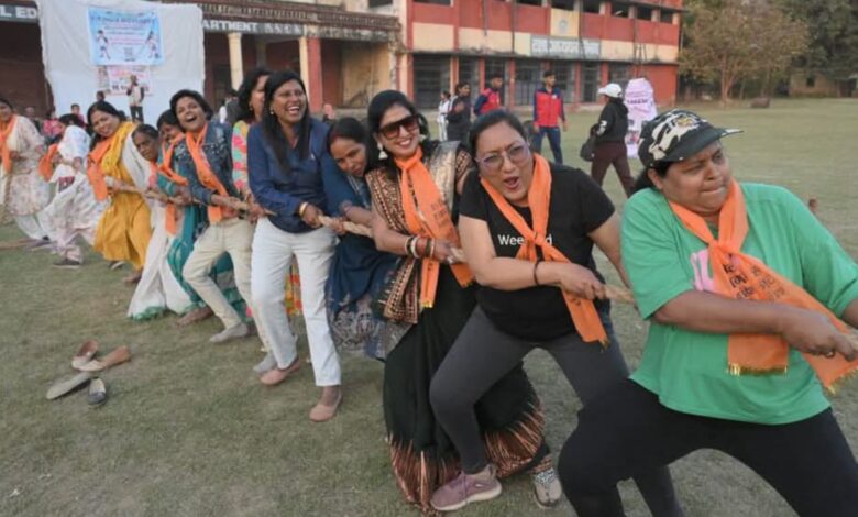 खेलजगत द्वारा स्वदेशी खेल स्पर्धा में महिलाओं ने चलाई गुलेल,लाठी,रस्साकशी, एकड़-दुक्कड़ हुआ