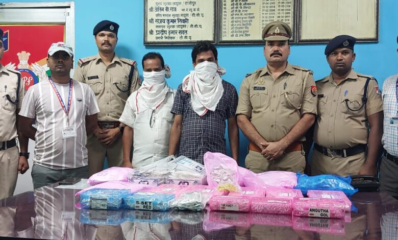 जहां दोनों व्यक्तियों से पूछताछ करने पर अपना नाम व पता-(1) दिलीप कुमार,उम्र करीब 55 वर्ष,पुत्र रामलाल जी ठाकुर,निवासी- वार्ड नं0-16 ठाकुर सोनार की गली डुमराव,बक्सर ,थाना डुमराव ,जिला- बक्सर(बिहार) (2)चंदन कुमार वर्मा,उम्र करीब 34 वर्ष,पुत्र स्व बबन प्रसाद वर्मा ,निवासी वार्ड नं0-16 जुठन उपाध्याय की गली डुमराव,बक्सर ,थाना डुमराव ,जिला- बक्सर(बिहार) बताया।दोनों के पास से बरामद एक काले रंग का पिटठु बैग एवं दो सफेद रंग का वजनी झोला को चेक करने पर उसमें 19 अदद छोटे-बड़े पैकेटो में सफेद धातु का निर्मित आभुषण पायल,बिछिया, अंगुठी इत्यादि पाया गया।अग्रिम पूछताछ में दोनों ने बताया कि उक्त जेवरात को वाराणसी से लेकर बक्सर बिहार जा रहे है।परंतु इस संबंध में दोनों के द्वारा कोई वैध दस्तावेज प्रस्तुत नही किया जा सका।अतः उपरोक्त बरामद आभुषण के संबंध में आवश्यक कारवाई हेतु