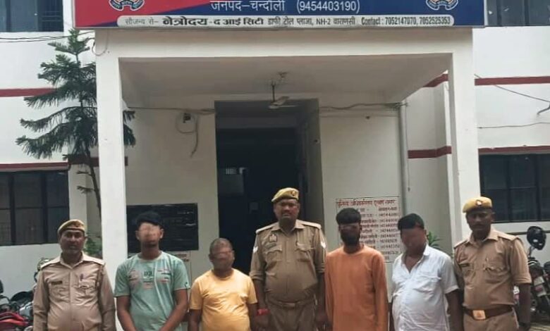 चन्दौली,सैयदराजा: आदित्य लांग्हे पुलिस अधीक्षक चन्दौली द्वारा अपराध व अपराधियों के विरुद्ध प्रभावी कार्यवाही हेतु दिये गये निर्देशो के अनुपालन मे चलाये जा रहे अभियान के क्रम में अनन्त चन्द्रशेखऱ (आई.पी.एस.), अपर पुलिस अधीक्षक सदर व देवेन्द्र कुमार, क्षेत्राधिकारी सदर के कुशल पर्यवेक्षण/मार्गदर्शन में विन्देश्वर प्रसाद पाण्डेय प्रभारी निरीक्षक थाना सैयदराजा द्वारा गठित टीम द्वारा थाना सैयदराजा क्षेत्र में दिनांक 07.08.2025 को कस्बा सैयदाराजा मे दो समुदायो के बीच हुए मारपीट, गाली गलौज तथा छेडखानी में पंजीकृत मु0अ0सं0 222/2025 धारा 76/118(2)/115(2)/ 352/351(2)/191(2) बीएनएस में 04 वांछित अभियुक्तो को मनराजपुर जाने वाले मुख्य मार्ग से आज दिनांक 09.08.2025 को समय करीब 13.40 बजे गिरफ्तार किया गया। गिरफ्तारी के आधार पर आवश्यक कार्यवाही की जा रही है।