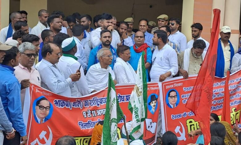 चंदौली: भारतमाला परियोजना,बंदरगाह, फ्रेट विलेज, सड़क चौड़ीकरण सहित तमाम परियोजनाओं के लिए अधिग्रहित की जा रही जमीनों तथा प्रभावित मकान का उचित मुआवजा दिए बिना परियोजनाओं को लागू करने के लिए जबरदस्ती किसानों को जमीन से बेदखल करने तथा मकान को गिराने की कार्यवाही पर रोक लगाते हुए भूमि अधिग्रहण कानून 2013 का अनुपालन कराया जाए,भारतमाला परियोजना के तहत प्रभावित रेवसा गांव के दलित बस्ती के सभी लोगों को जमीन का पट्टा देकर आवास दिया जाए उक्त बातें रेवसा बस्ती बचाओ संघर्ष समिति के बैनर तले भाकपा(माले) के नेतृत्व में जिलाधिकारी कार्यालय का घेराव करते हुए हुई सभा को संबोधित करते हुए भाकपा(माले) राज्य स्थाई समिति सदस्य चंदौली जिला सचिव कामरेड अनिल पासवान ने कही।